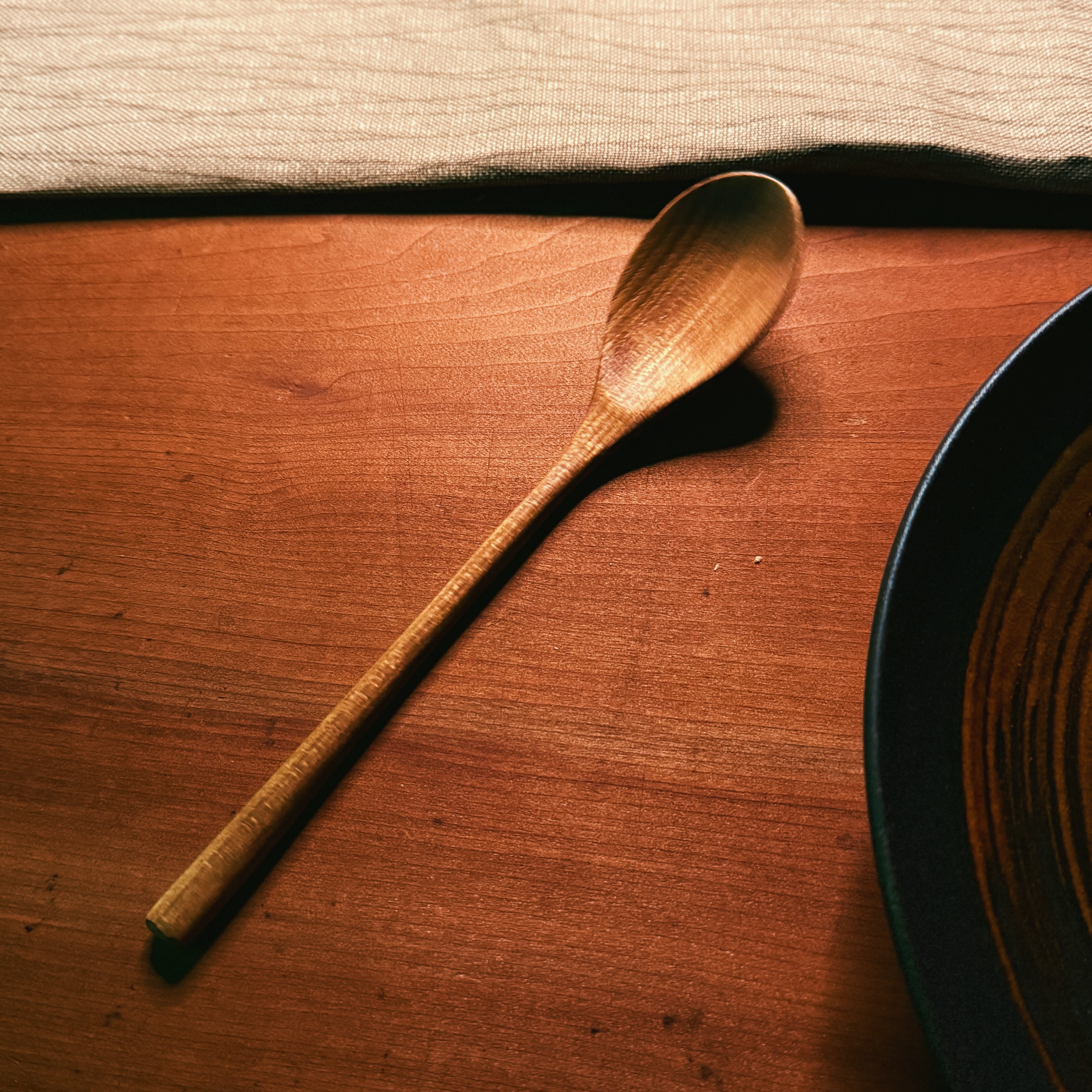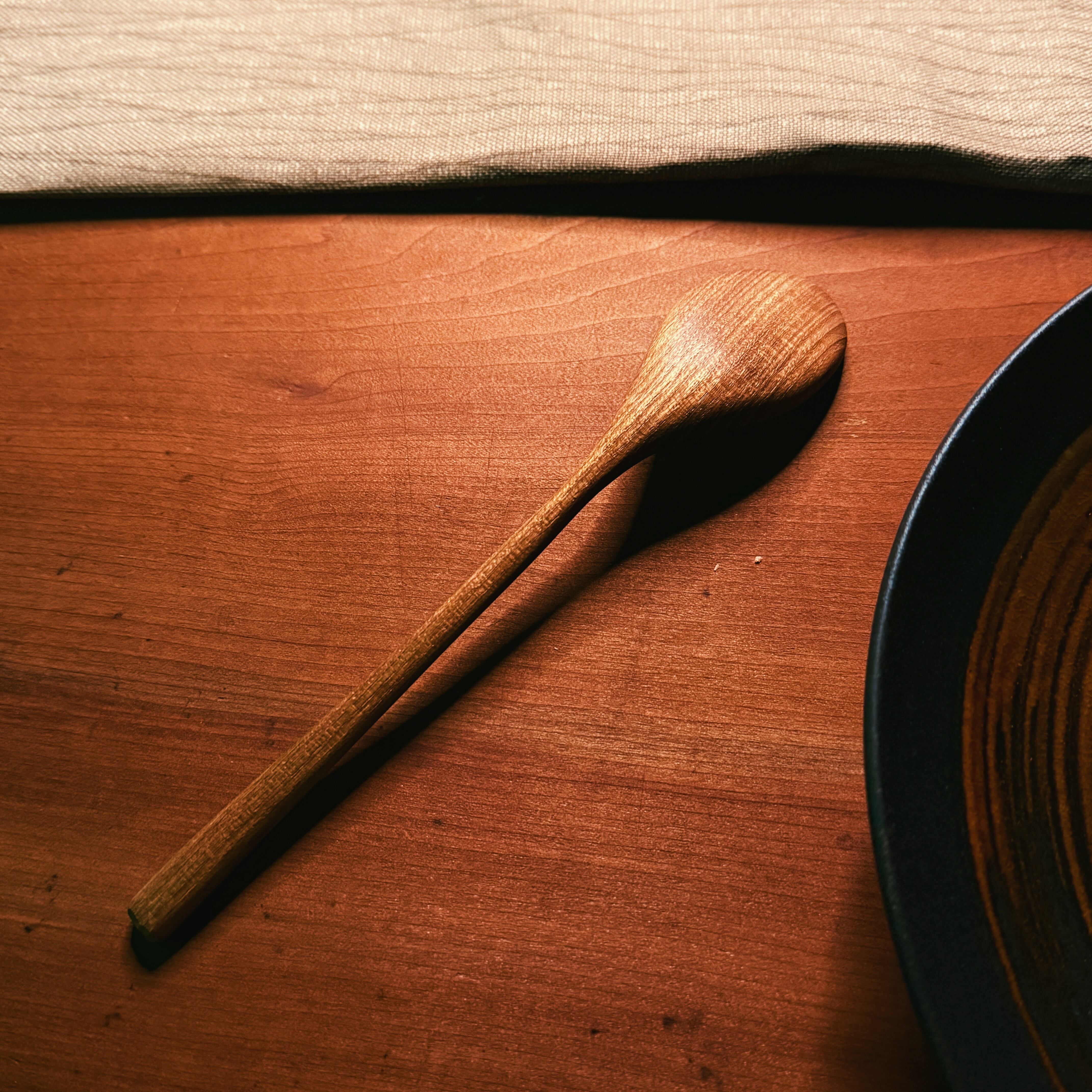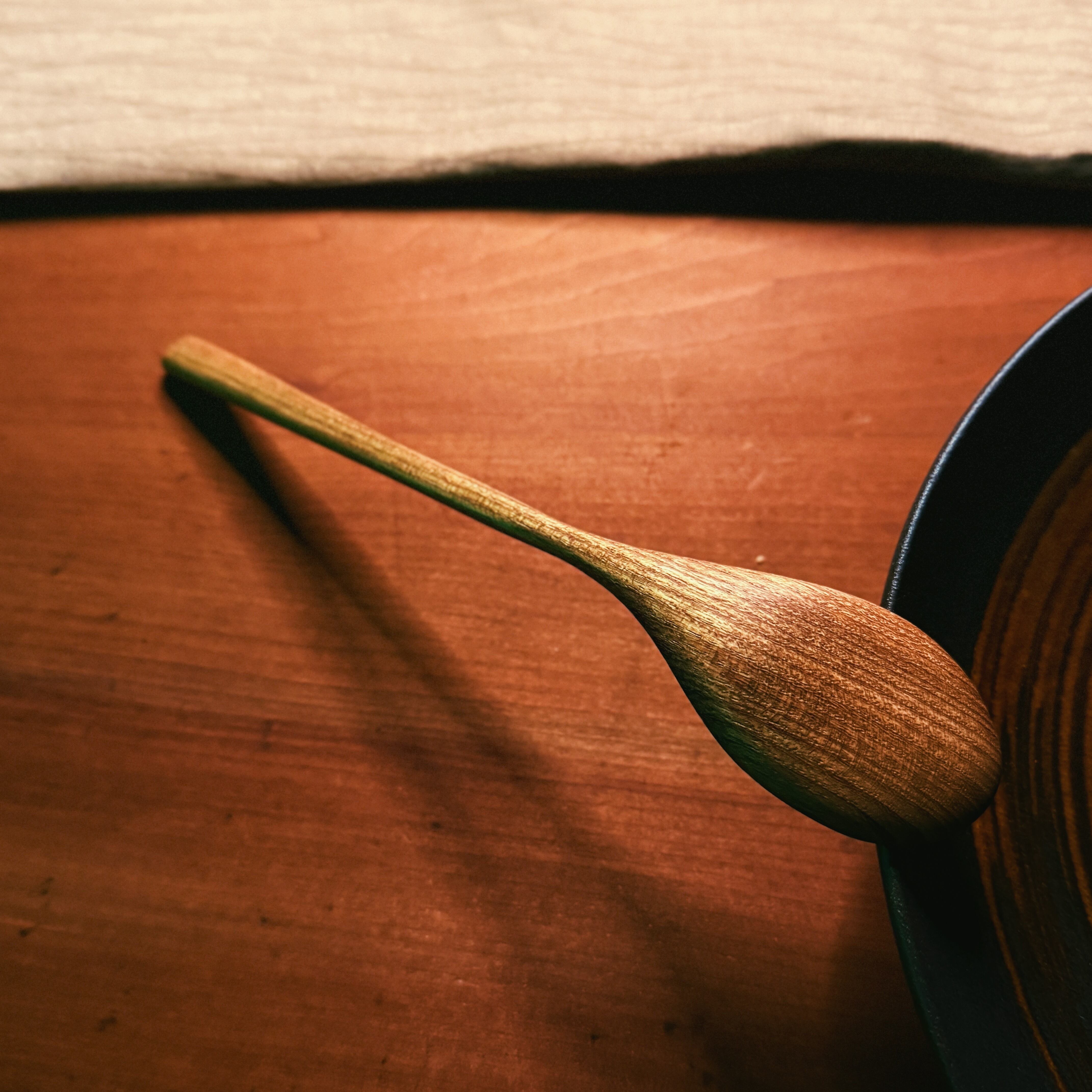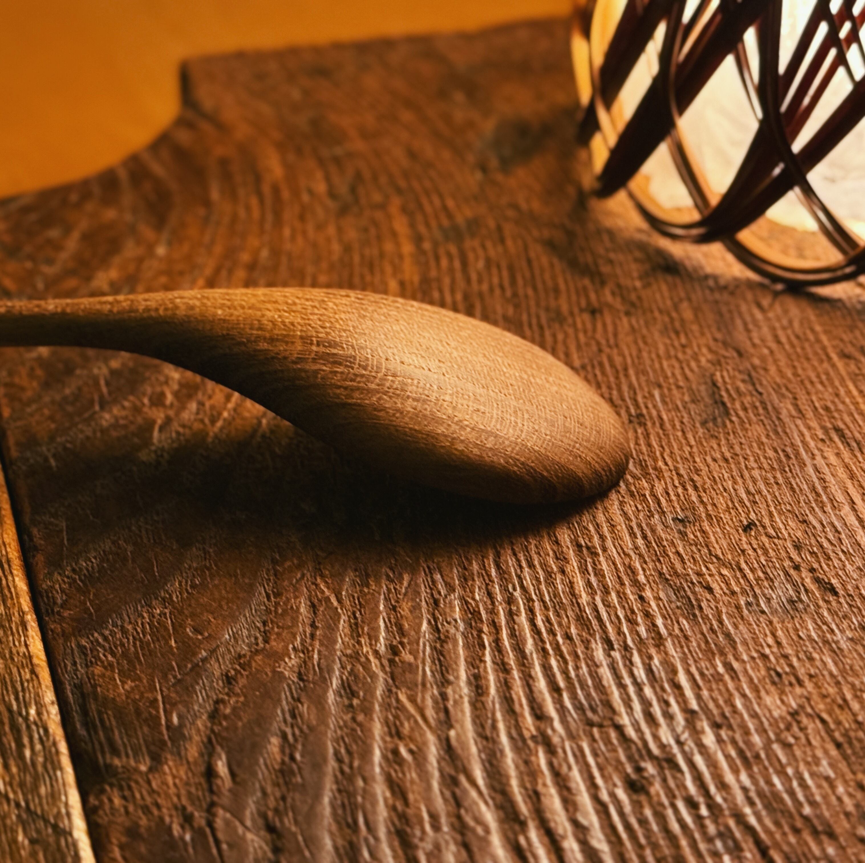 丁寧に削り出したこのスプーンは、やわらかな曲線と手に馴染む優しい手触りが特長。槐特有の落ち着いた飴色の木肌は、使うほどに味わいが深まり、世界にひとつの風合いへと育っていきます。
