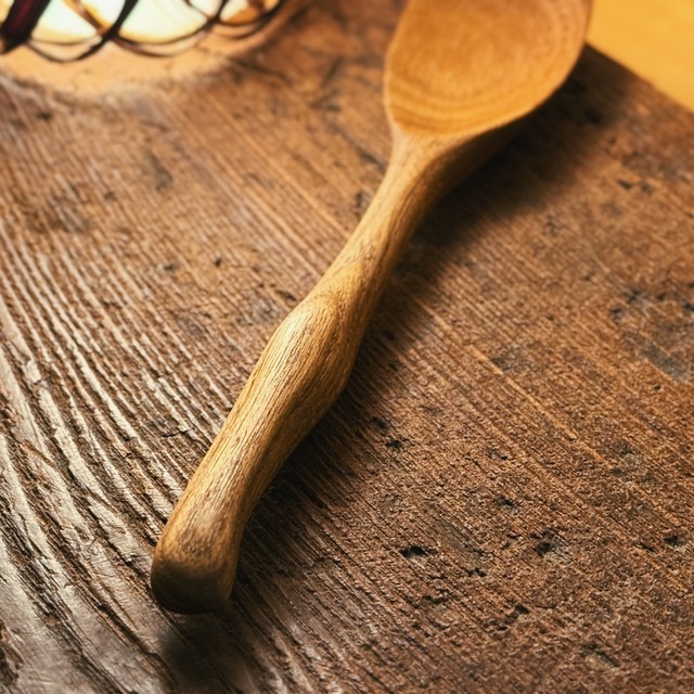 縁起の良い木として古くから親しまれてきた槐(えんじゅ)の木。 その槐を使い手彫りで仕上げた木べらです。 木ならではのやさしい当たりで フライパンや鍋を傷つけにくいのも特徴です。 素材:槐(えんじゅ) 仕上げ:胡桃オイル サイズ:全長21.2cm × 幅4cm × 柄13.5cm (※多少の誤差があります) ✴︎ 在庫・販売について ✴︎ こちらの作品は マルシェでも販売を行っております。 そのため、ご注文のタイミングによっては 「完売」となる場合がございます。 一点ものの特性上、何卒ご理解いただけますと幸いです。 【お取り扱いのご注意】 この木べらは天然木・天然オイル仕上げのため、長く心地よくお使いいただくために、以下の点にご注意ください。 ・使用後はやわらかいスポンジで優しく手洗いし、水気をしっかり拭き取ってください。 ・食洗機・電子レンジ・乾燥機のご使用はお控えください。 ・長時間のつけ置き洗いや、湿気の多い場所での保管は木の劣化につながります。 ・乾燥が気になる場合は、天然オイル(くるみ油・えごま油など)を布に取り、軽く拭いて保湿してあげると長持ちします。 ・火気のそばや高温になる場所には置かないでください。 自然の素材を生かしたやさしい木べらです。 時間とともに変化する木の風合いをお楽しみいただきながら、末長くご愛用いただけますように。