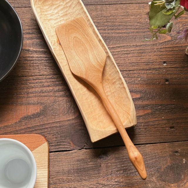 やさしい色合いと、なめらかな手触り。 北海道のさくら材を使い、ひとつずつ手作業で仕上げた木べらです。 さくらの木は、木目が細かく、ほどよい硬さがあり 調理の際に鍋やフライパンを傷つけにくいのが特徴 オイル仕上げのため、 使い込むほどに色味が深まり、 自分の暮らしに馴染んでいく変化も楽しめます。 「消耗品」ではなく、 長く使い続ける道具として。 素材:さくら 仕上げ:胡桃オイル サイズ:全長22.2cm × 幅5.5cm × 柄13cm (※多少の誤差があります) ✴︎ 在庫・販売について ✴︎ こちらの作品は マルシェでも販売を行っております。 そのため、ご注文のタイミングによっては 「完売」となる場合がございます。 一点ものの特性上、何卒ご理解いただけますと幸いです。 【お取り扱いのご注意】 この木べらは天然木・天然オイル仕上げのため、長く心地よくお使いいただくために、以下の点にご注意ください。 ・使用後はやわらかいスポンジで優しく手洗いし、水気をしっかり拭き取ってください。 ・食洗機・電子レンジ・乾燥機のご使用はお控えください。 ・長時間のつけ置き洗いや、湿気の多い場所での保管は木の劣化につながります。 ・乾燥が気になる場合は、天然オイル(くるみ油・えごま油など)を布に取り、軽く拭いて保湿してあげると長持ちします。 ・火気のそばや高温になる場所には置かないでください。 自然の素材を生かしたやさしい木べらです。 時間とともに変化する木の風合いをお楽しみいただきながら、末長くご愛用いただけますように。